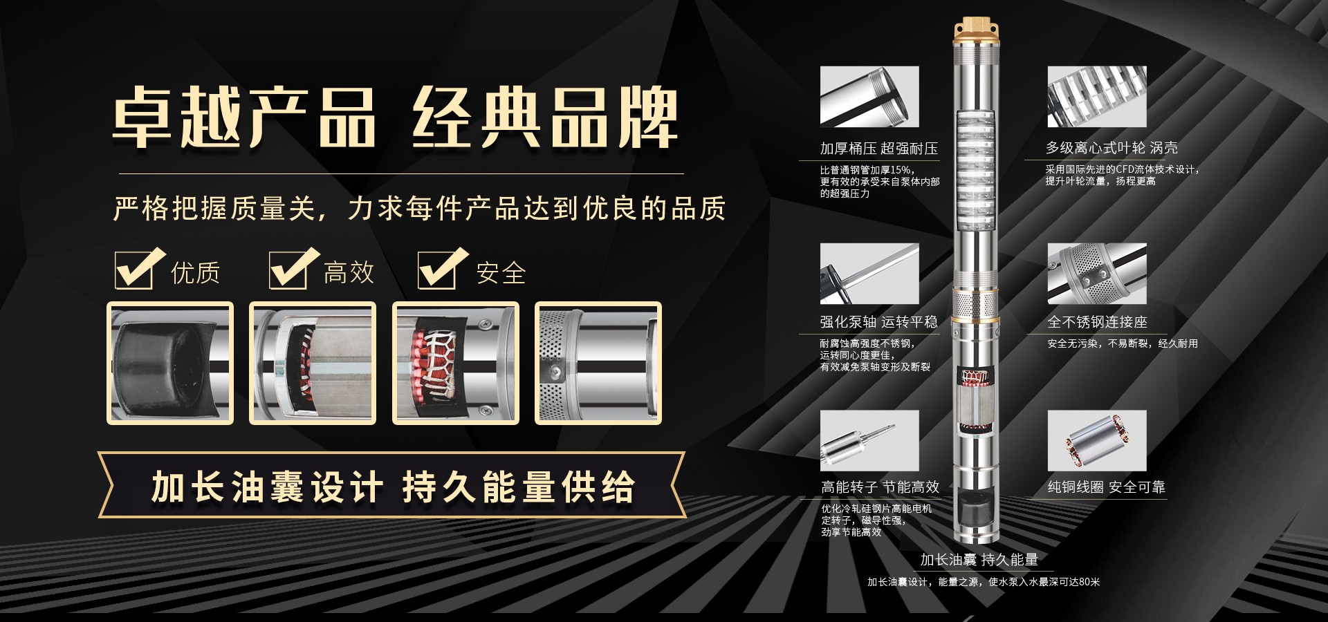 不僅僅是泵,更是流動的科技。十多年來,本公司堅持走:以質(zhì)量求生存以科技創(chuàng)新求發(fā)展,重合同守信用的道路,生產(chǎn)經(jīng)營得到迅速發(fā)展。更希望以后不管從發(fā)達城市到新農(nóng)村,從工業(yè)制造到尖端科技產(chǎn)業(yè)都隨處可見創(chuàng)江井泵的身影,創(chuàng)江深井泵已成為干萬用戶心目中優(yōu)質(zhì)和信心的保證我們將以優(yōu)質(zhì)的產(chǎn)品和最完善的售后服務(wù)來真誠與各界朋友開展廣泛的合作,共同創(chuàng)造一個美好的未來!